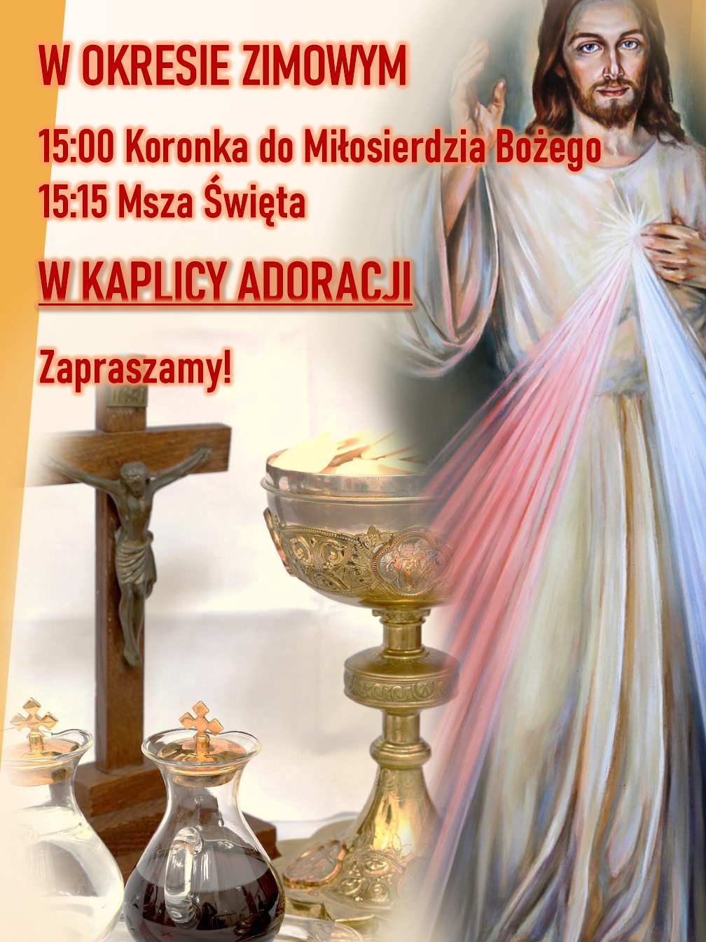 Ze względu na niskie temperatury Koronka do Bożego Miłosierdzia o godz. 15.00 oraz Msza św. o godz. 15.15 przez cały okres zimowy w dni powszednie będzie sprawowana w KAPLICY ADORACJI NAJŚWIĘTSZEGO SAKRAMENTU. Zapraszamy!